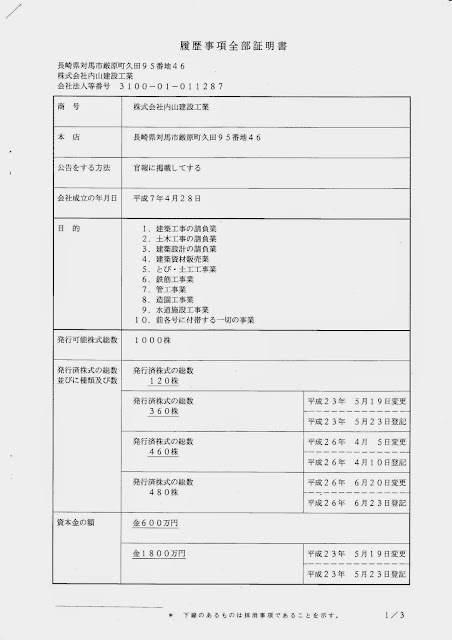 まずは、内山建設工業(登記簿は数ページもあるので、1ページ目だけアップします。)
